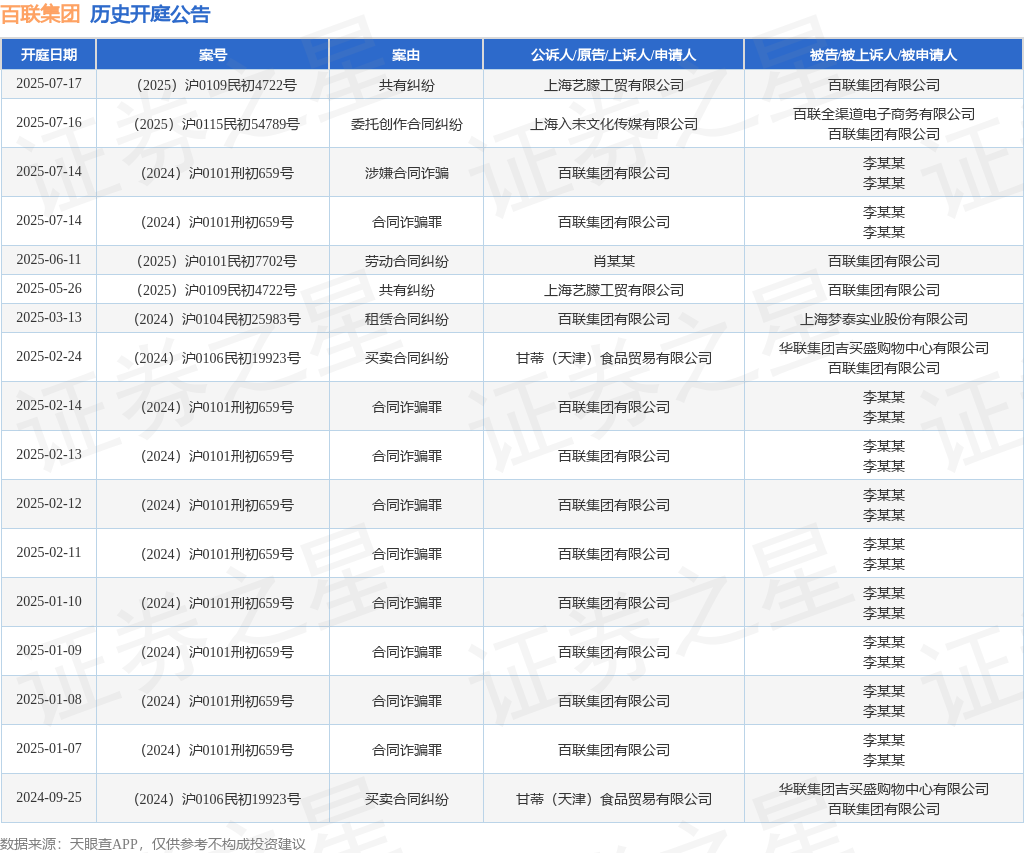 案号:(2025)沪0115民初54789号审理法院:上海市浦东新区人民法院案由:委托创作合同纠纷当事人信息: 原告/上诉人:上海入未文化传媒有限公司 被告/被上诉人:百联全渠道电子商务有限公司、百联集团有限公司开庭日期:2025年7月16日根据统计,近一年内以百联集团有限公司为当事人的历史开庭公告有17则,其中案由为“合同诈骗罪”的公告以9则居首,其次为“买卖合同纠纷”有2则,“共有纠纷”有2则。历史开庭公告如下: